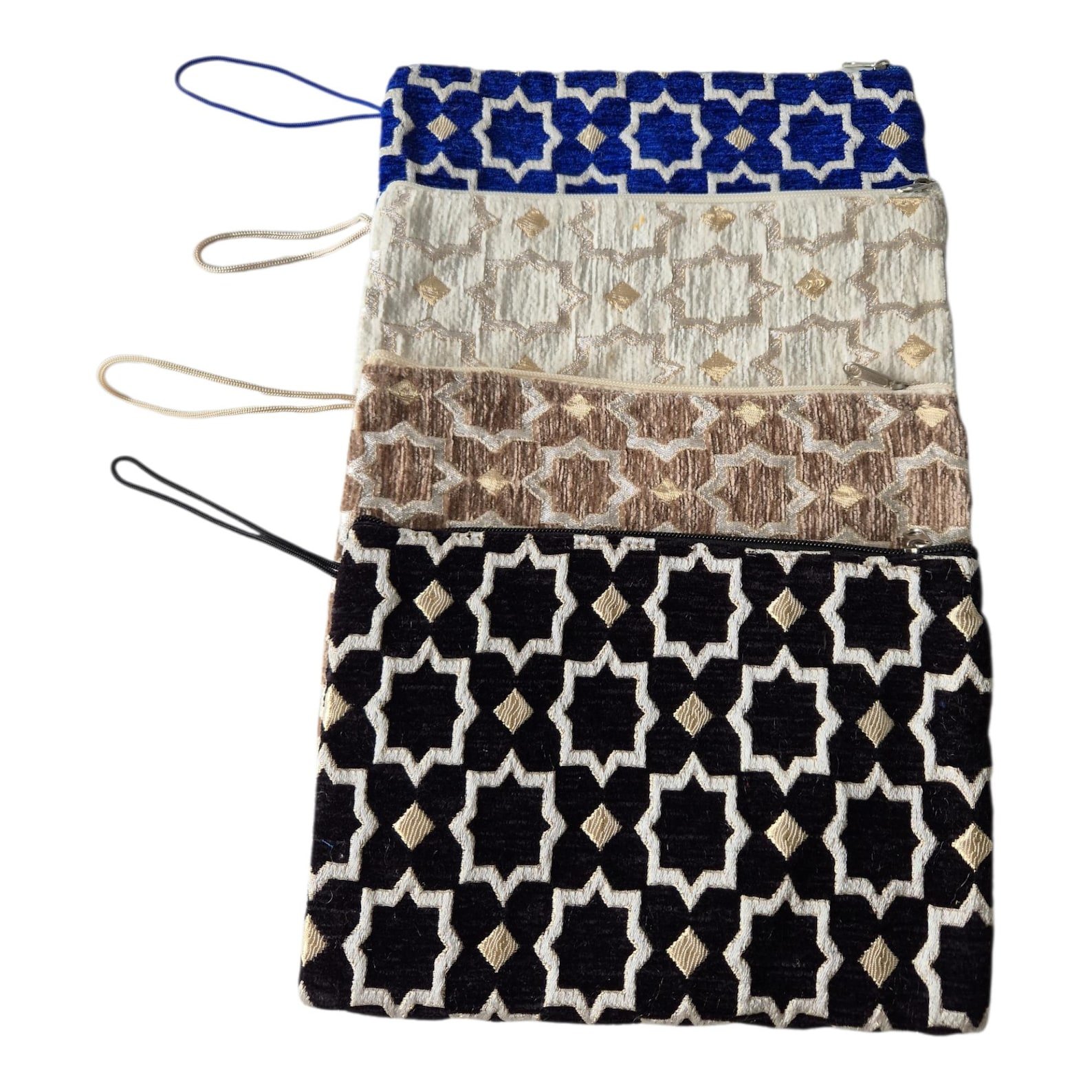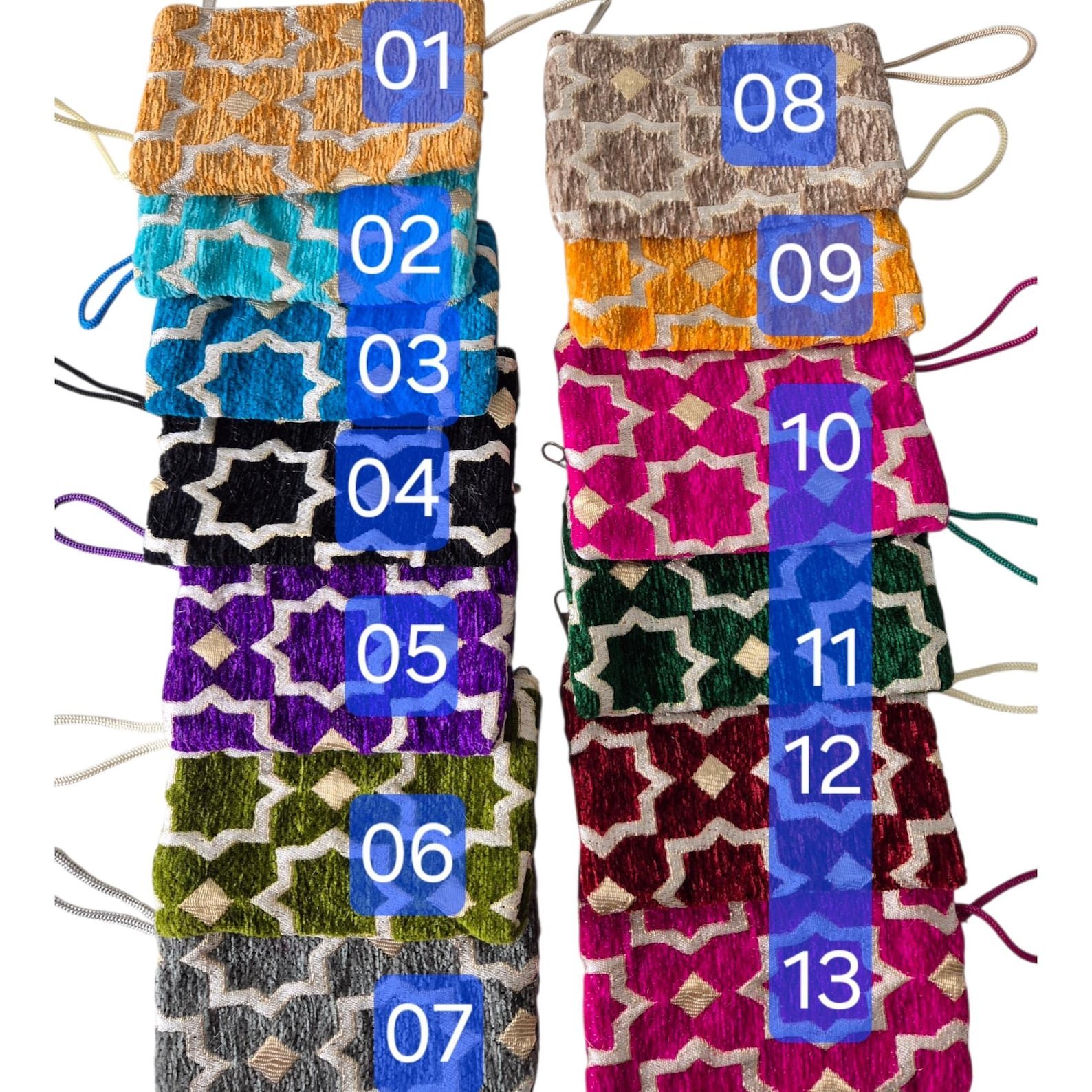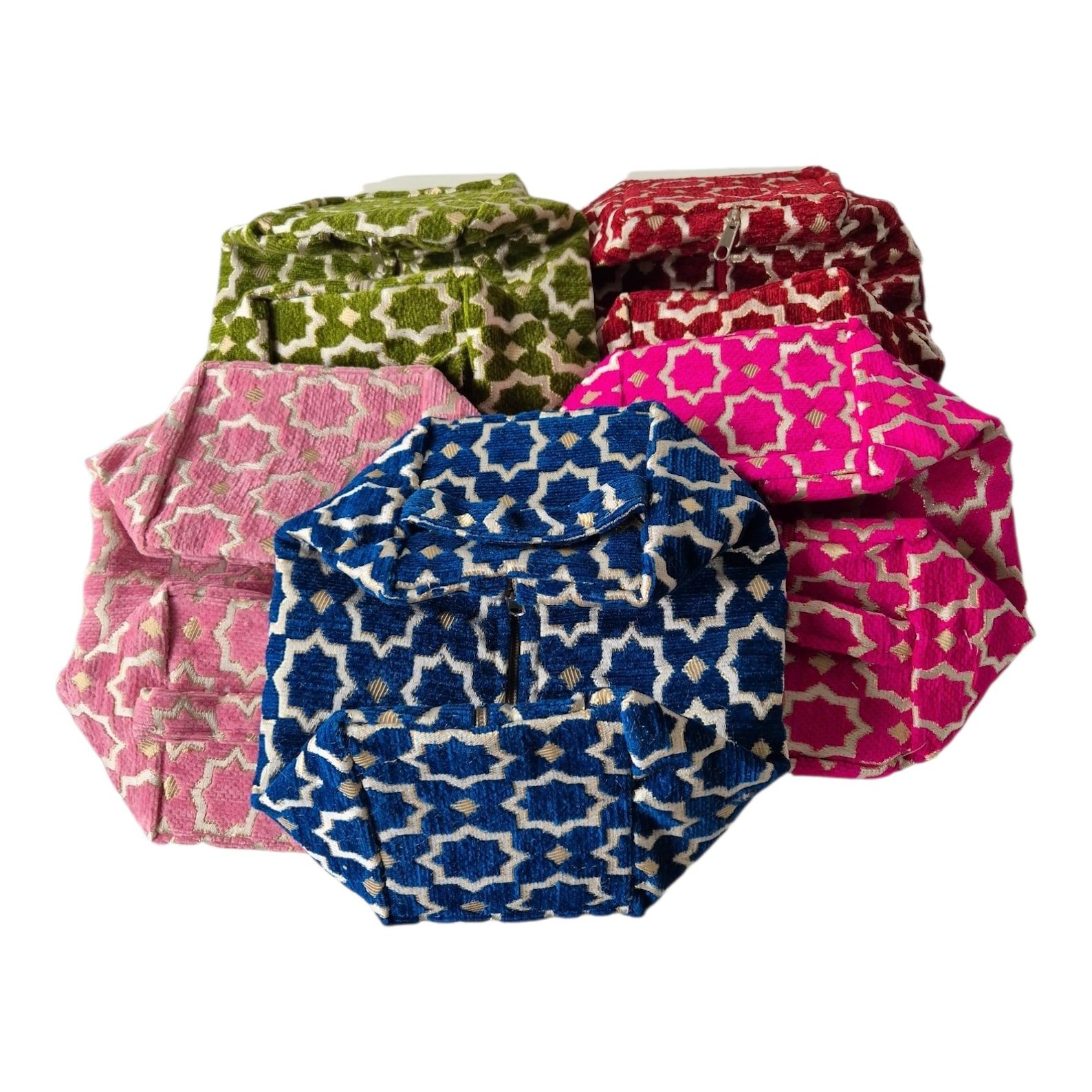 Here are some examples of what these bags look like in different colors (the pattern is a classic geometric Moroccan design with a velvet texture and shiny details):
