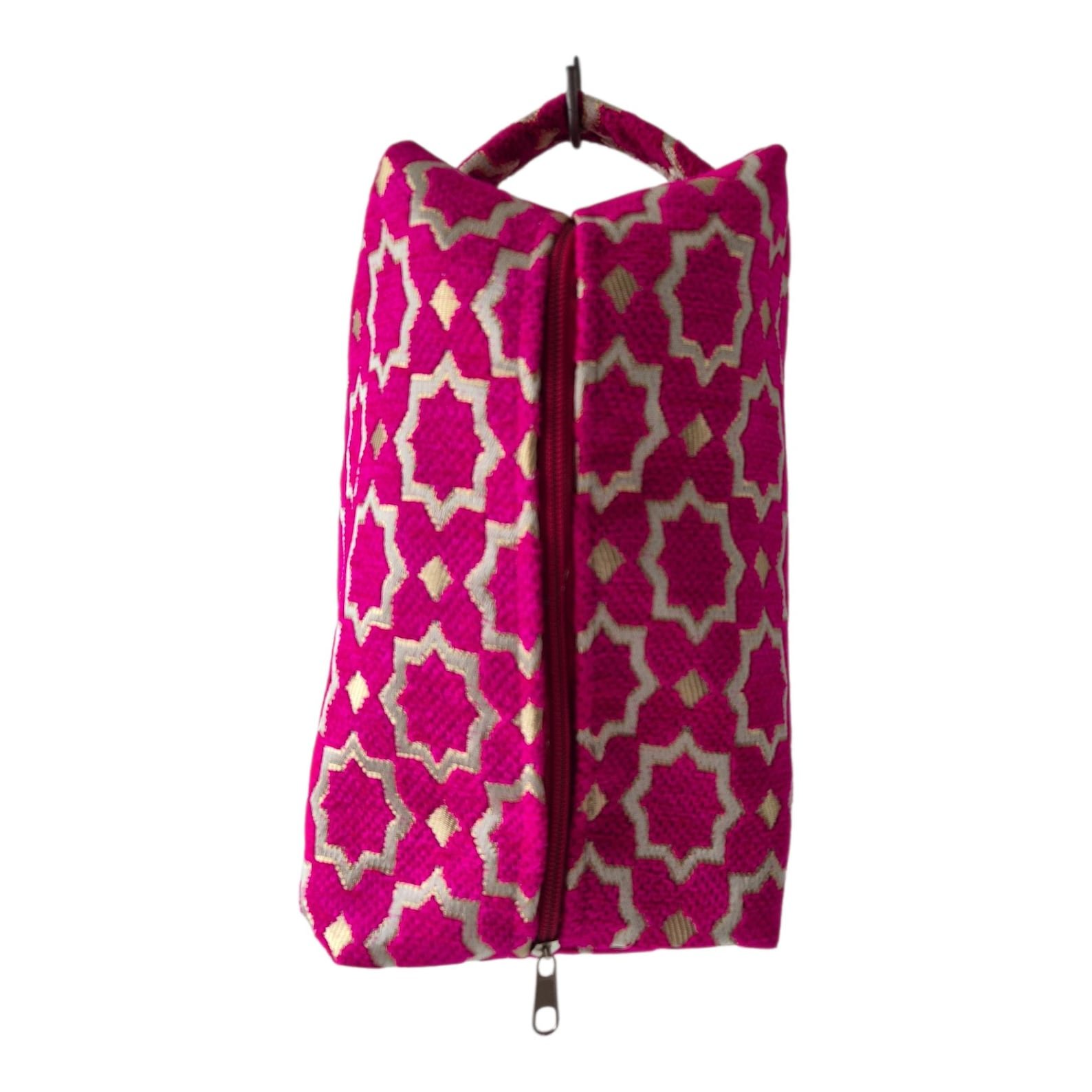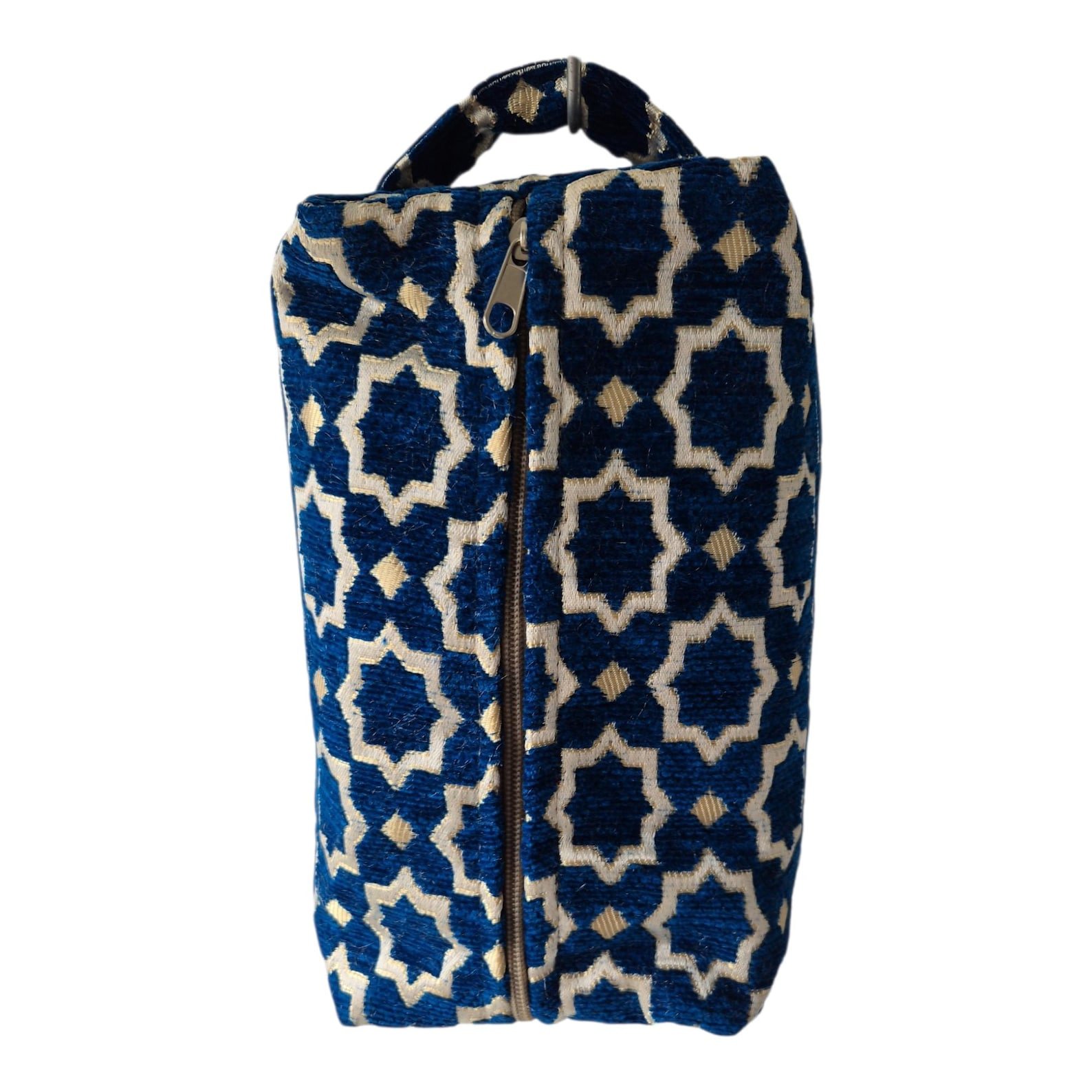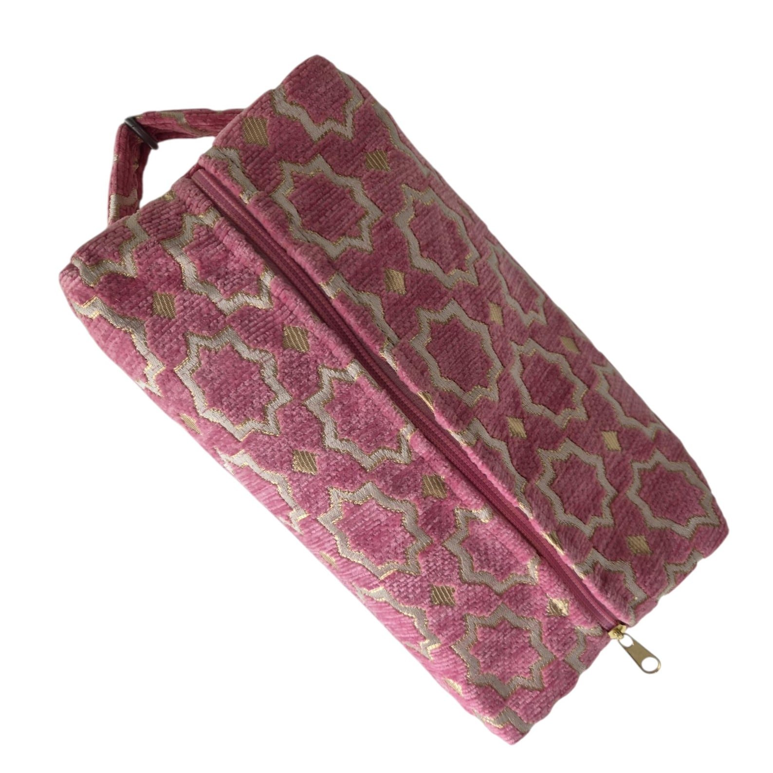 Here is a beautiful and authentic Moroccan brocade velvet zippered pouch — exactly as you describe! It is a handmade makeup bag / toiletry bag / small handbag with a rich, exotic look.