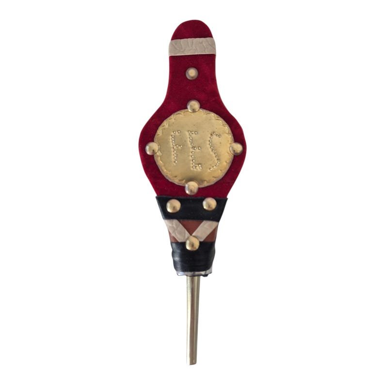 - Material — Solid wood (often cedar or other hardwood), genuine leather (sometimes camel leather or leather effect), and brass/copper parts such as the spout (mouthpiece) and decorative rivets/ornaments. The rivets hold the leather in place and provide a beautiful handcrafted detail.